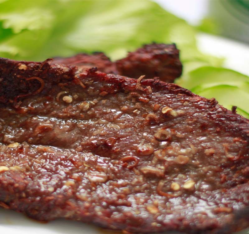 Không phẩm màu – Không chất bảo quản – 100% tự nhiên, chỉ có thịt bò sạch, muối kiến vàng và gia vị Tây Nguyên.